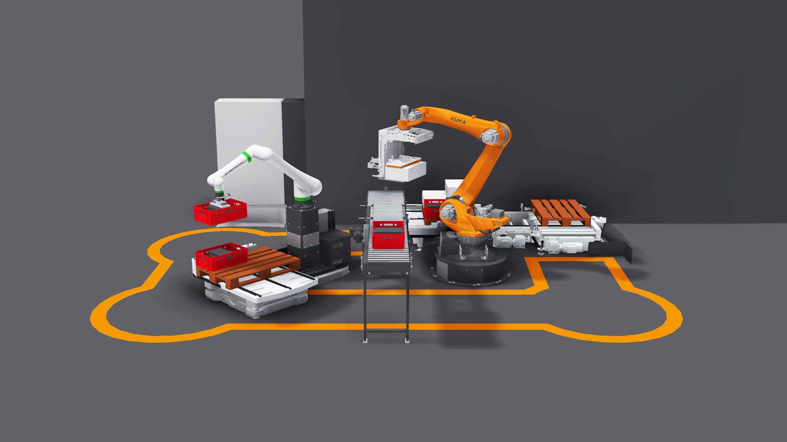 den autonomen Transport zwischen definierten Stationen. Das mobile Robotersystem dockt selbstständig an und übernimmt die Paletten im laufenden Takt – ohne Unterbrechung des Materialflusses.