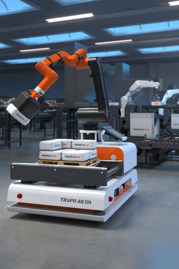 La combinazione offerta dal sistema di trasporto senza conducente e cobot promette un elevato grado di stabilità. In un unico sistema s’incontrano due esigenze dell’industria dell’imballaggio. Equipaggiato con un robot MRK, lo shuttle di trasporto TRAPO (serie TTS) vanta un’elevata flessibilità in termini di spazio, se il robot è impiegato come braccio aggiuntivo del collega umano. Trasporta, (de)palettizza, forma degli strati esatti e imballa.
